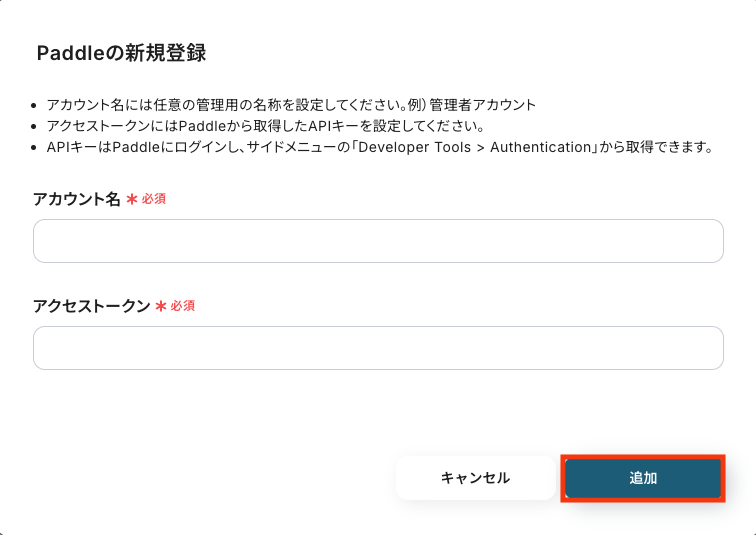 アカウント名、アクセストークンをそれぞれ入力し、「追加」をクリックします。