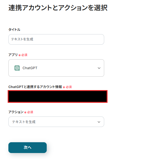 連携アカウントとアクションを選択する画面が表示されるので、今回連携するChatGPTのアカウントを確認し「次へ」をクリックします。