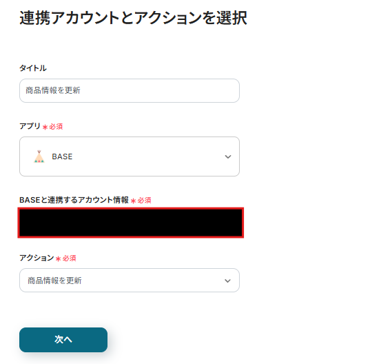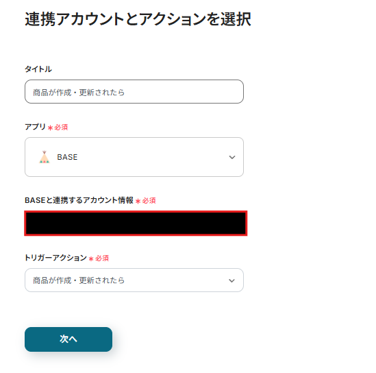 連携アカウントとアクションを選択する画面が表示されるので、今回連携するBASEのアカウントを確認し「次へ」をクリックします。