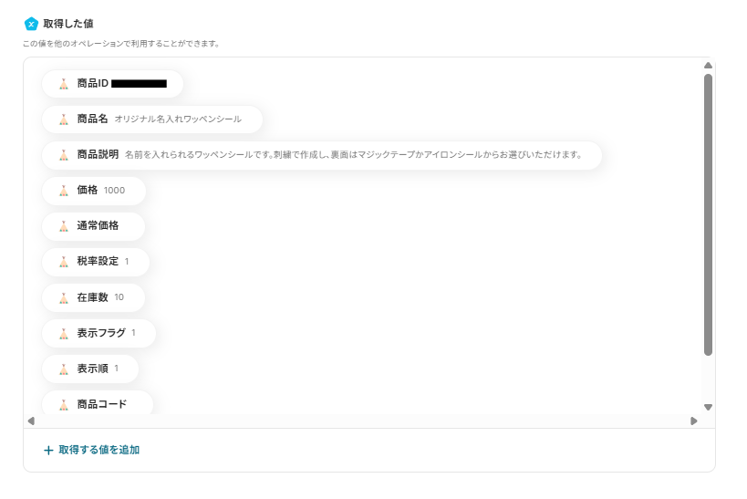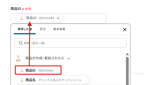 商品IDは以下のように、表示される取得した値から選択しましょう。