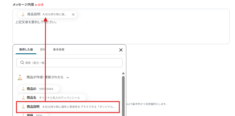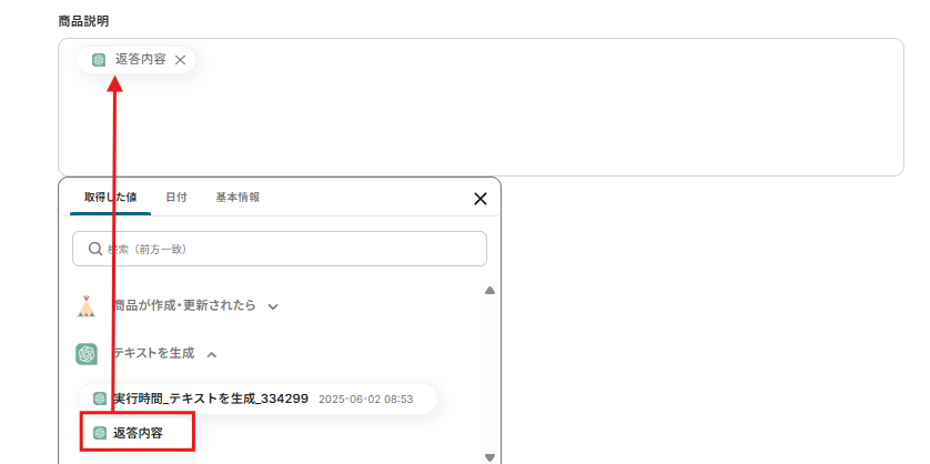 商品説明は、AIで生成した内容を取得した値から選択します。