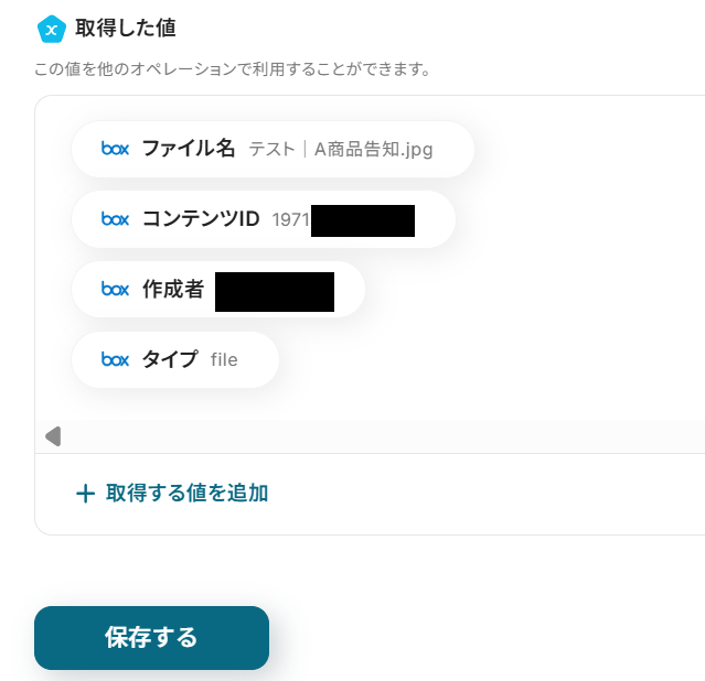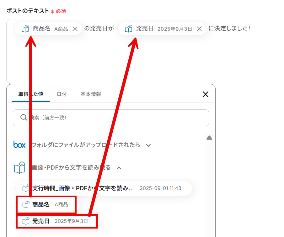 例えば、Boxに保存した画像ファイルからテキスト情報を読み取って投稿したり、特定の条件に合致するファイルのみを自動で投稿したりと、様々な業務を効率化することが可能です。