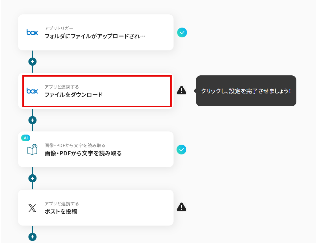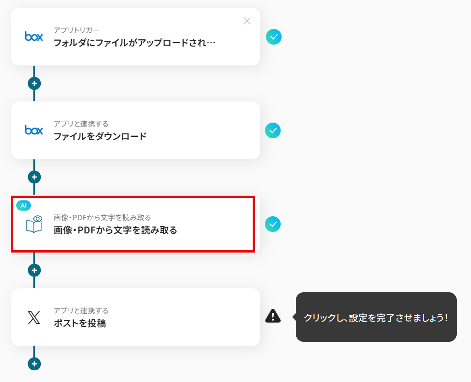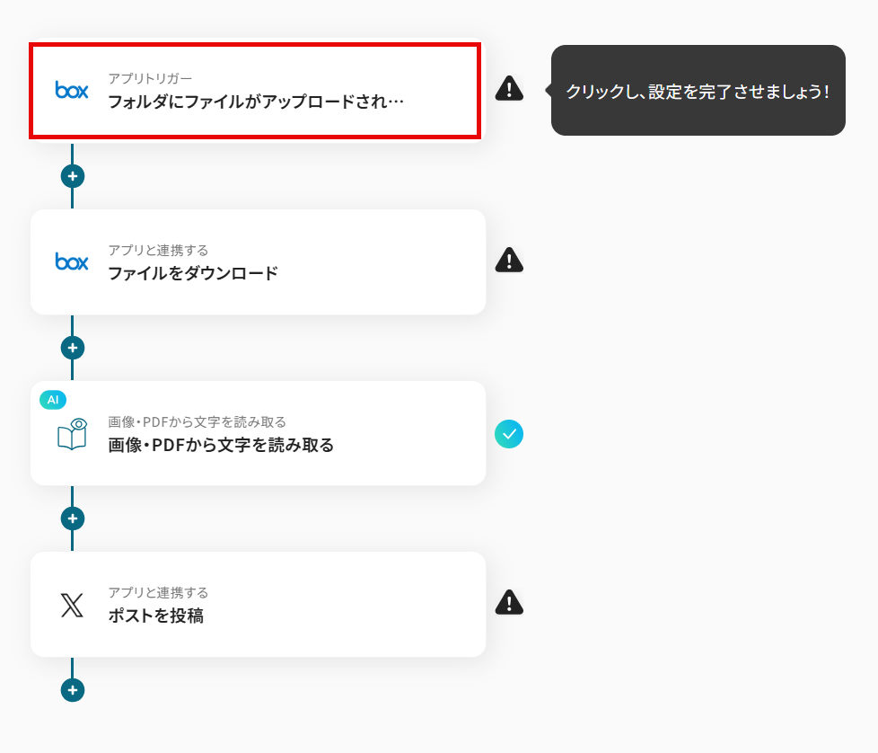 このワークフローは、特定のBoxフォルダにファイルがアップロードされると、OCR機能が自動でテキスト情報を読み取り、その内容をX(Twitter)へ投稿します。