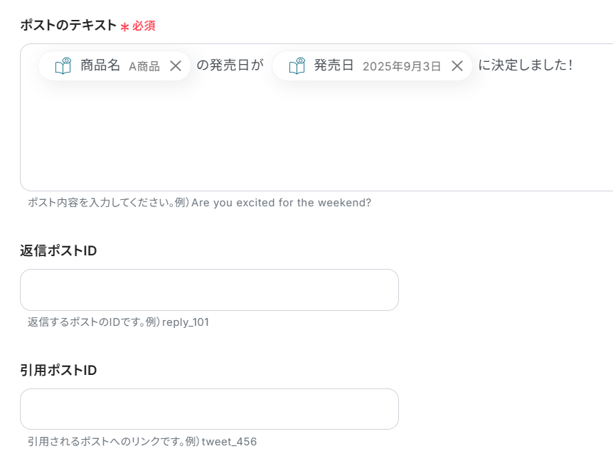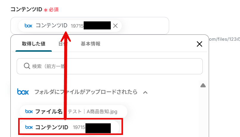 コンテンツIDのフィールドをクリックし、前項で取得した値から「コンテンツID」を選択します。