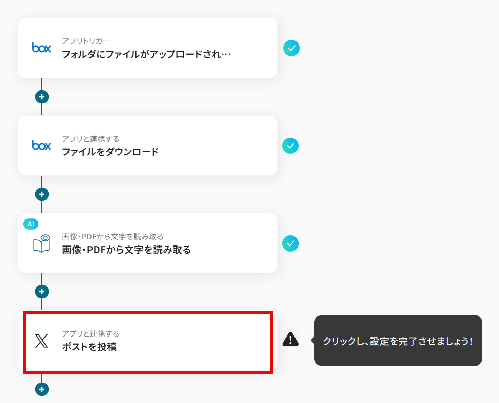 Box内の特定のフォルダにファイルがアップロードされた場合や、ファイル名に特定のキーワードが含まれている場合など、あらかじめ設定した条件に合致した時のみ、OCRで内容を読み取ってX(Twitter)に投稿する連携です。
