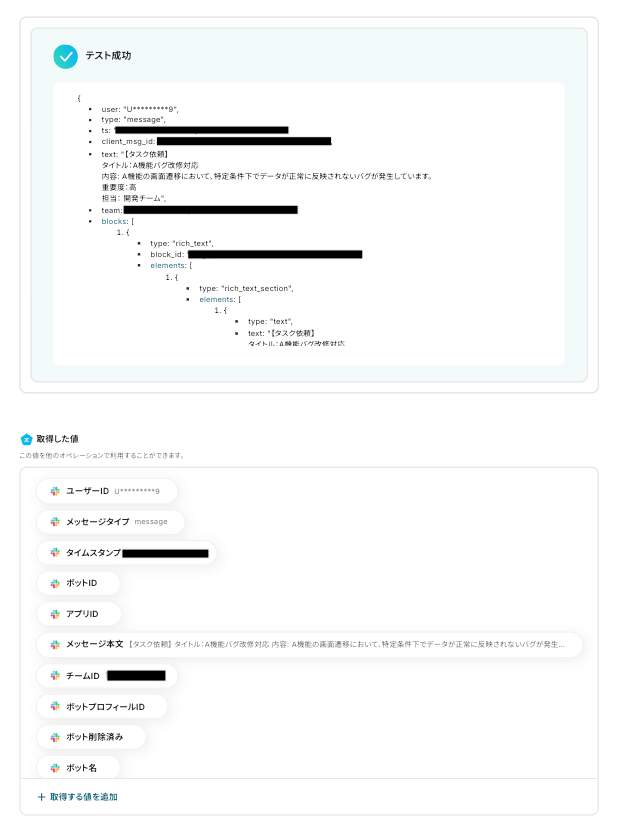 テストが成功すると、以下のように「取得した値」が表示されます。
