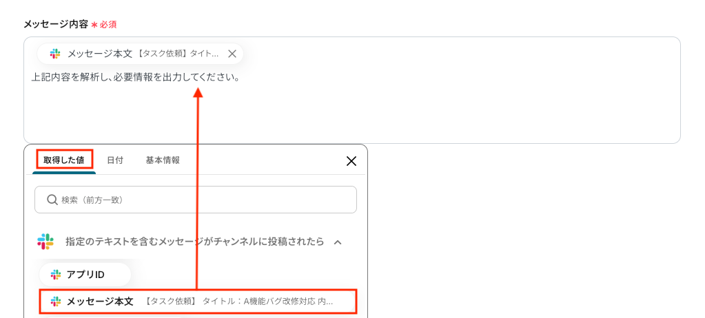 「メッセージ内容」は、取得した値から選択し、必要に応じて任意のテキスト(定型文)を手動で入力してください。