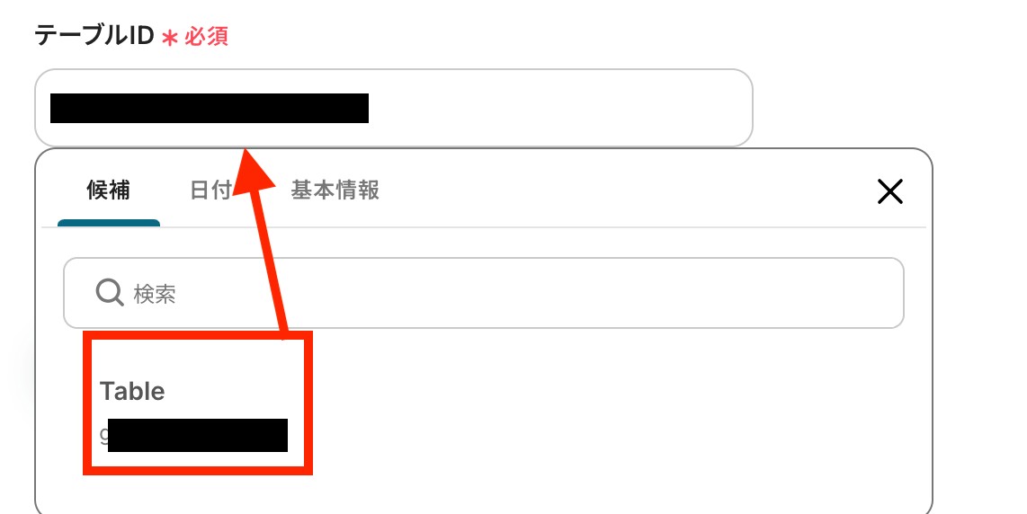 「テーブルID」も、候補から対象のテーブルIDを選択してください。