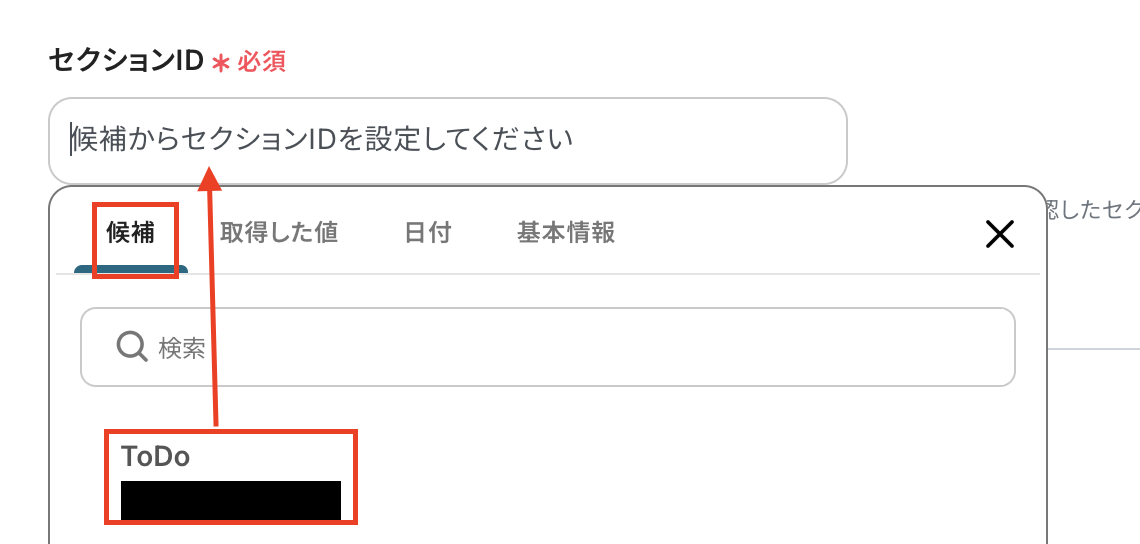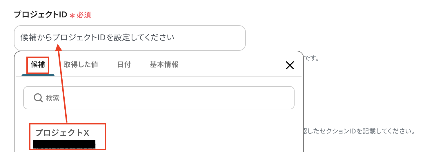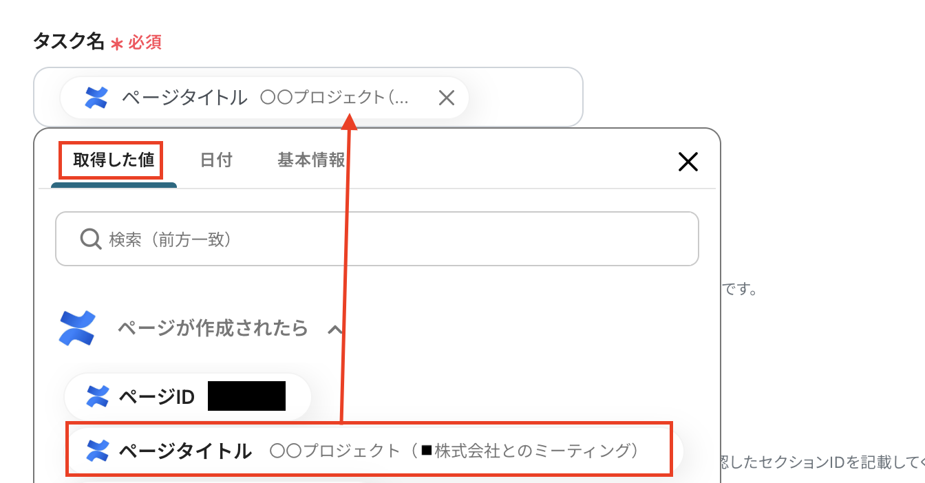 タスク名はConfluenceのトリガー(ページが作成されたら)で取得した値から「ページタイトル」を選択しましょう。