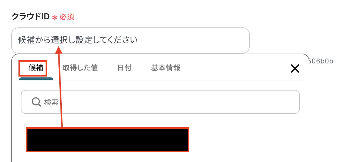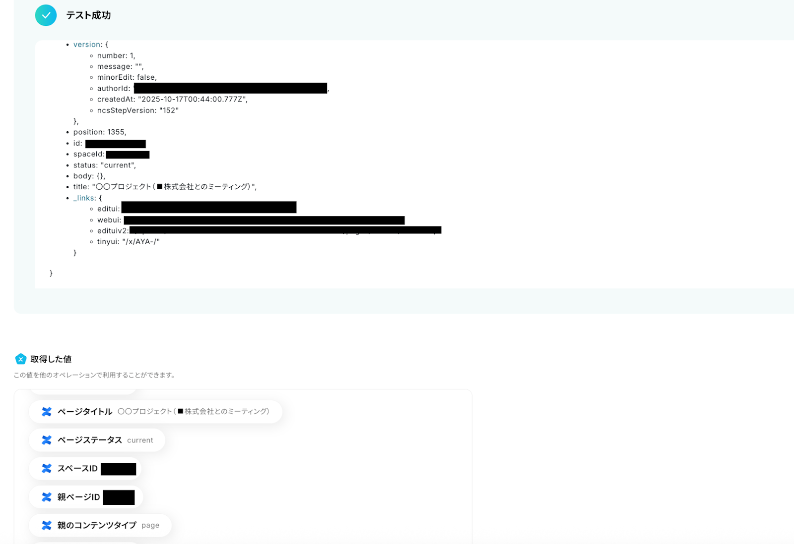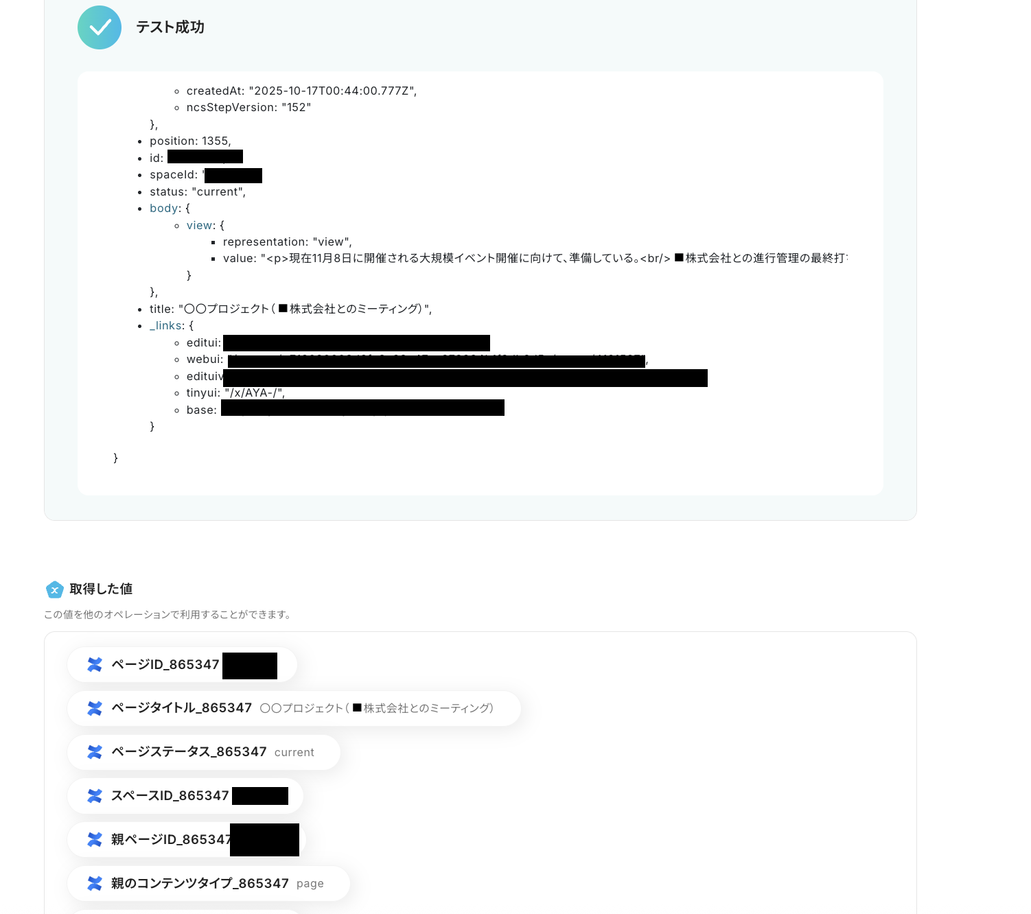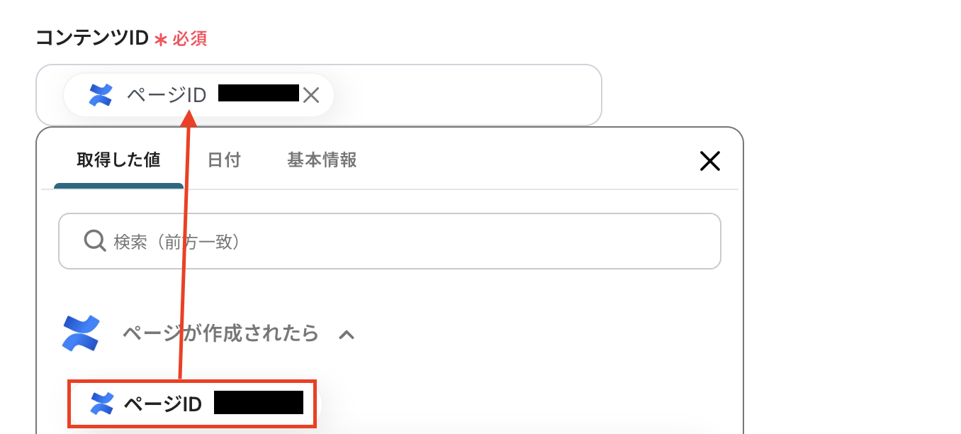 コンテンツIDにはConfluenceのトリガーで取得した値から「ページID」を選択しましょう。