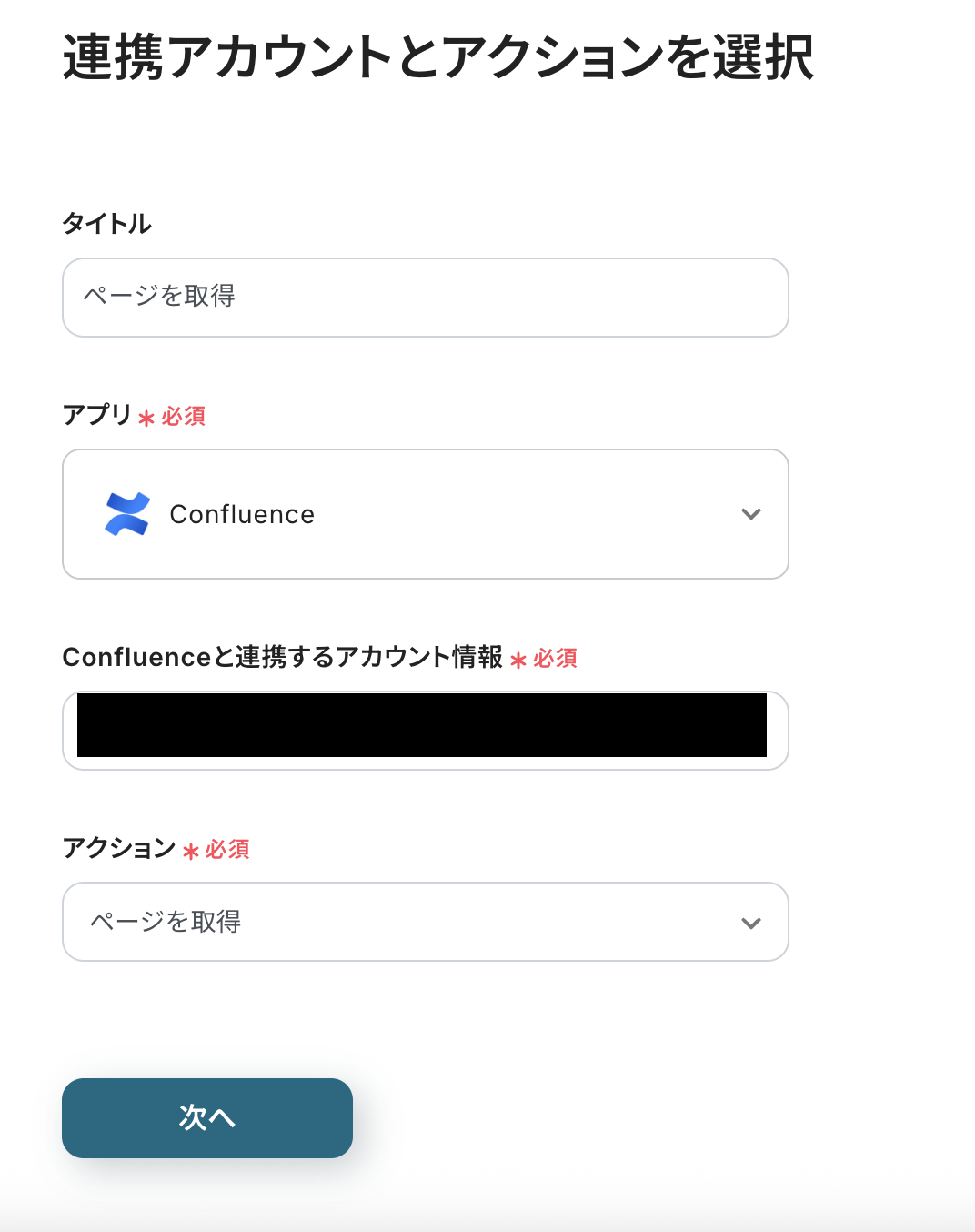 Confluenceと連携するアカウント情報を確認し、次へをクリックしてください。