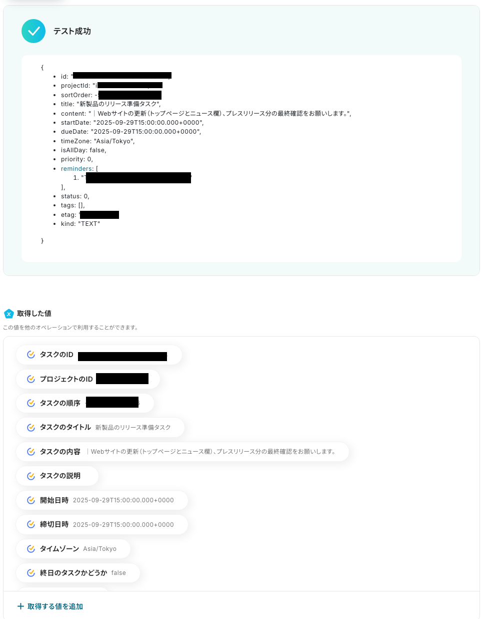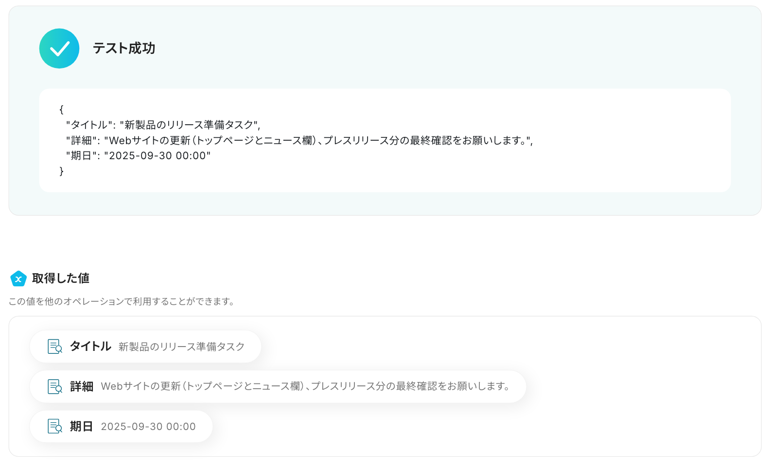 設定後、「テスト」をクリックし、取得した値を確認します。