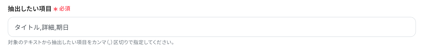 ここでは、対象のテキストから抽出したい項目をカンマ(,)で区切り、指定します。