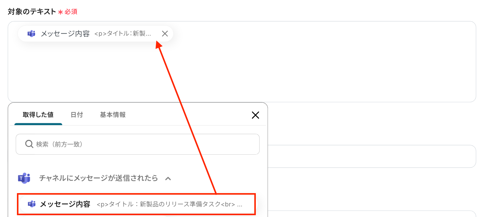 「チームID」と「チャンネルID」は、入力バーをクリックして表示される候補から選択してください。