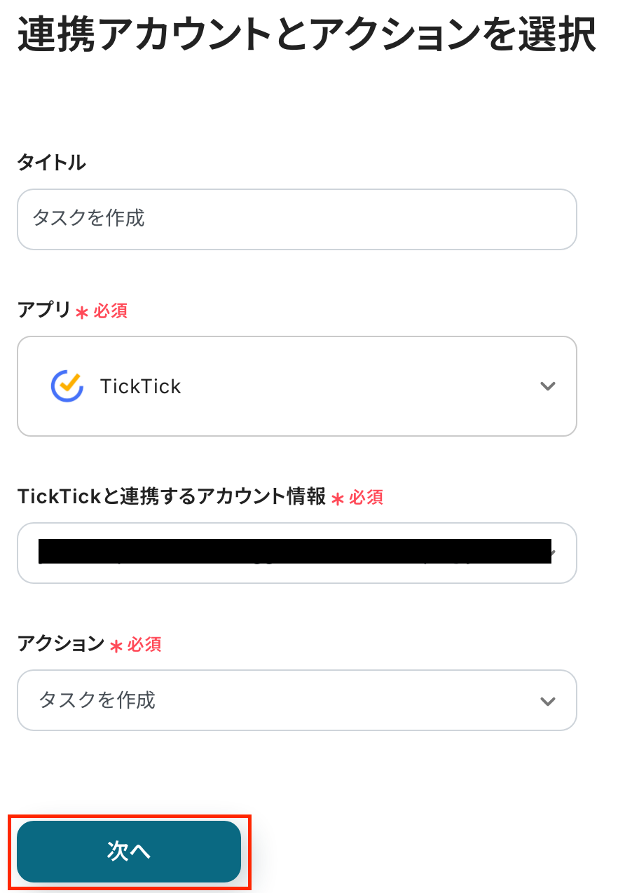 その上でTickTickにタスクを作成するアクション設定の際に、担当者や詳細を「タスク内容」の項目にマッピングすることが可能です。