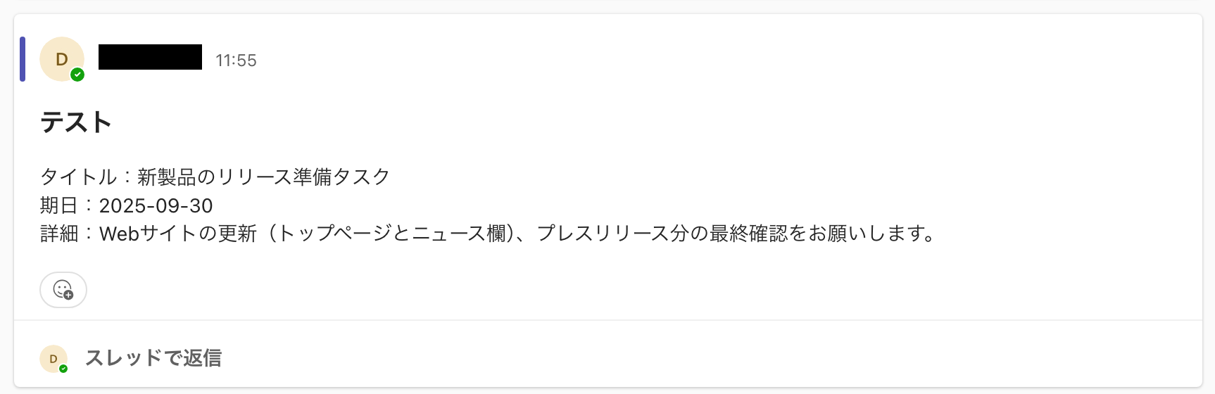 今回は例として、以下のメッセージを投稿しました。