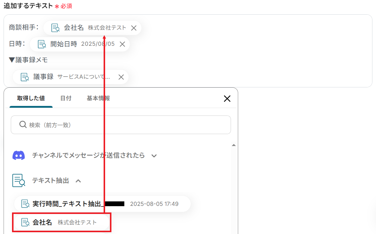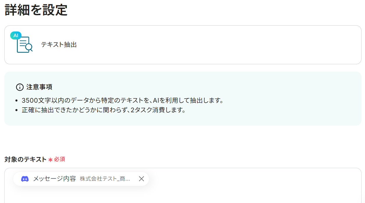 対象のテキストは予め設定されている通り、Discordの「メッセージ内容」のアウトプットで大丈夫です。