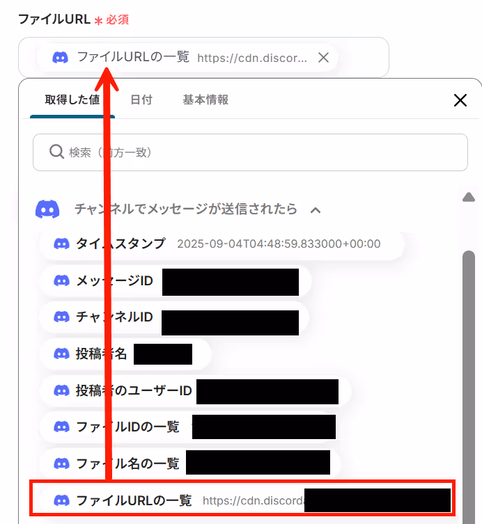 ファイル名のフィールドをクリックし、前項で取得した値から「ファイル」を選択します。