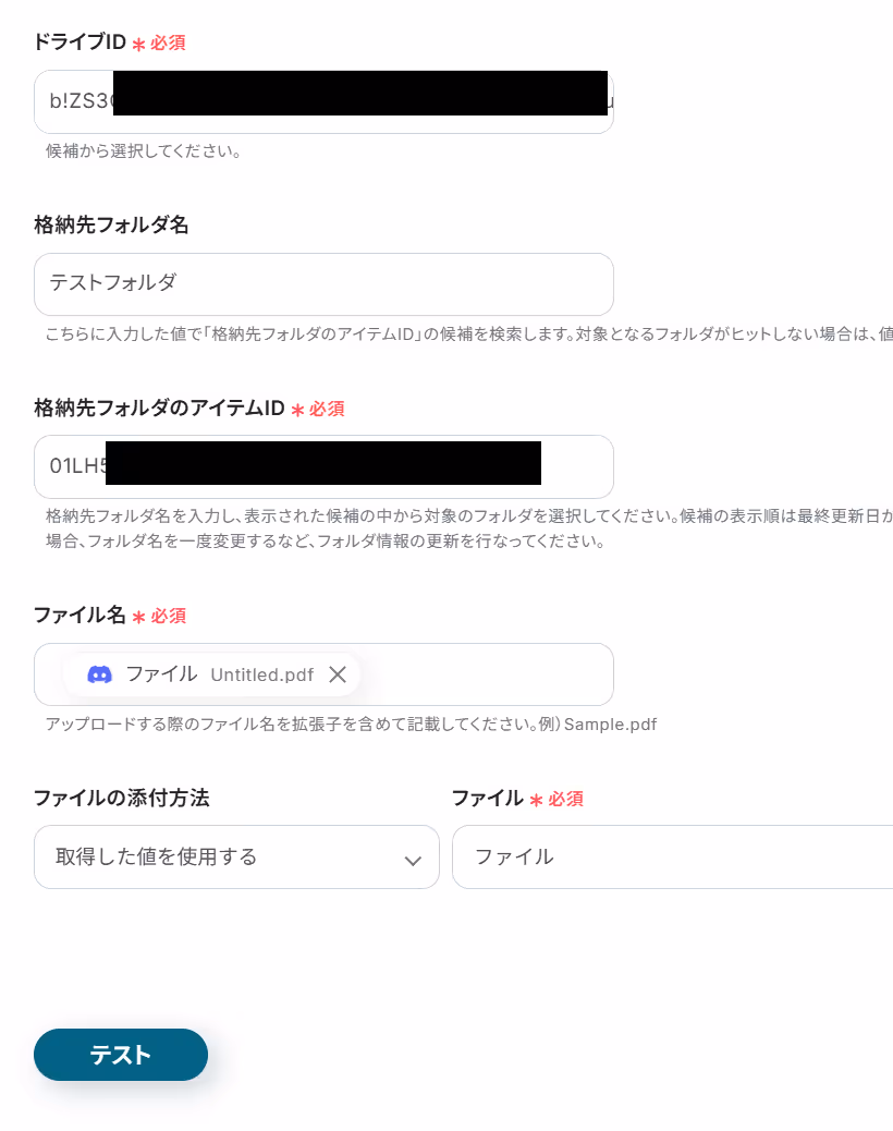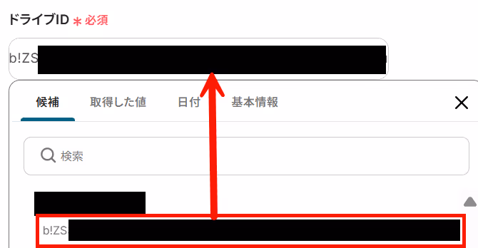 格納先フォルダのアイテムIDは、候補から選択してください。