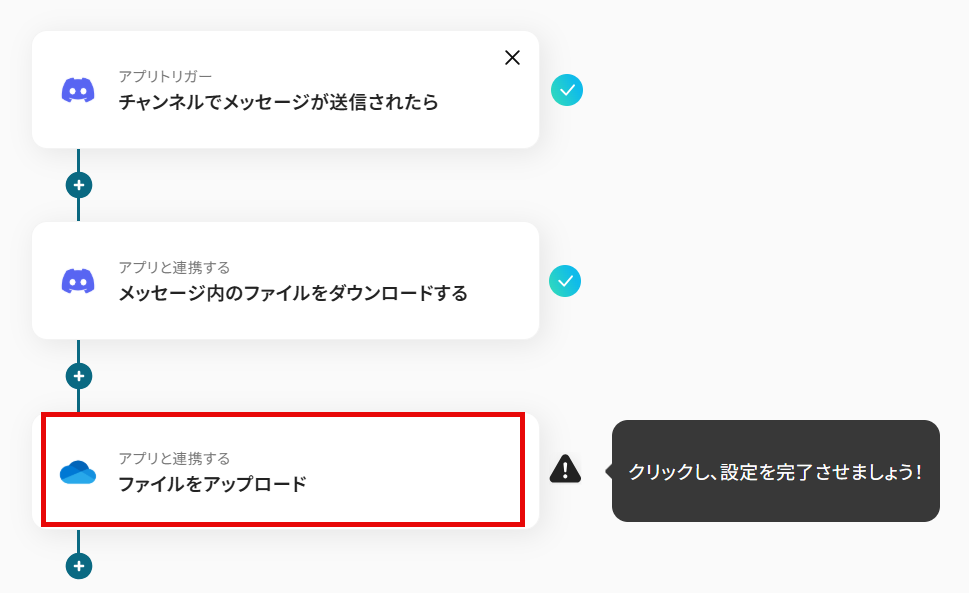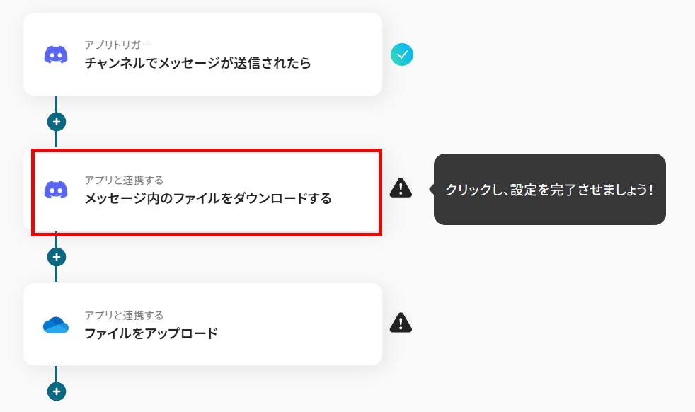 Discordのトリガー設定では、ファイル共有を検知する対象のサーバーID、チャンネルIDを任意で設定してください 分岐機能では、特定のファイル形式のみを対象にするなど、後続のオペレーションを起動させる条件を任意にカスタマイズできます OneDriveへのファイルアップロード設定では、ファイルの格納先フォルダやファイル名を、固定値や取得した情報をもとに任意で設定することが可能です ■注意事項