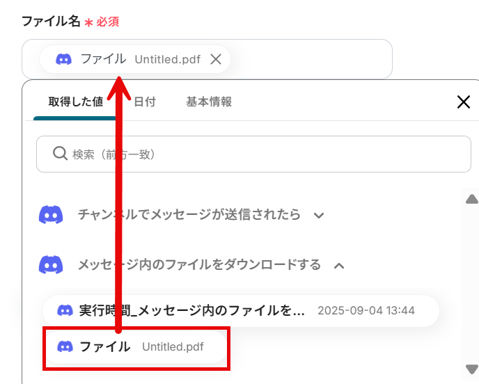 ファイル名のフィールドをクリックし、前項で取得した値から「ファイル」を選択します。 取得した値を使用することで、フローボットが起動する度に取得した新しいファイルが反映されます。