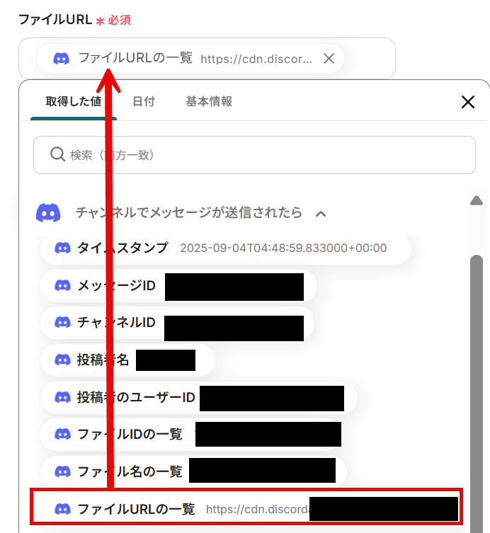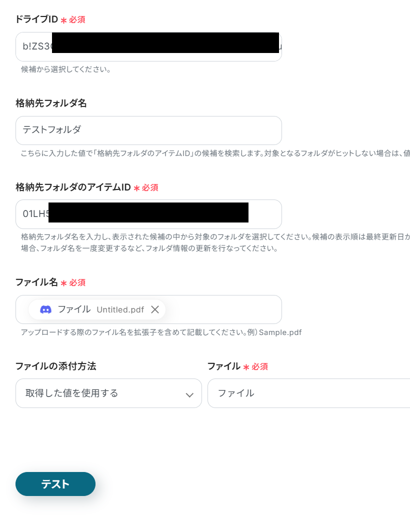 ファイルURLを前項で取得した値から選択します。 取得した値を使用することで、値が固定化されず、フローボットが起動するたびに新しいファイルURLが反映されます。 選択したら「テスト」をクリックしましょう。