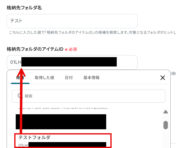 格納先フォルダ名を入力します。 格納先フォルダのアイテムIDは、候補から選択してください。