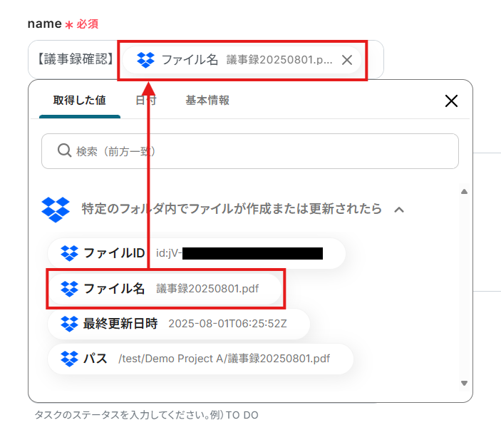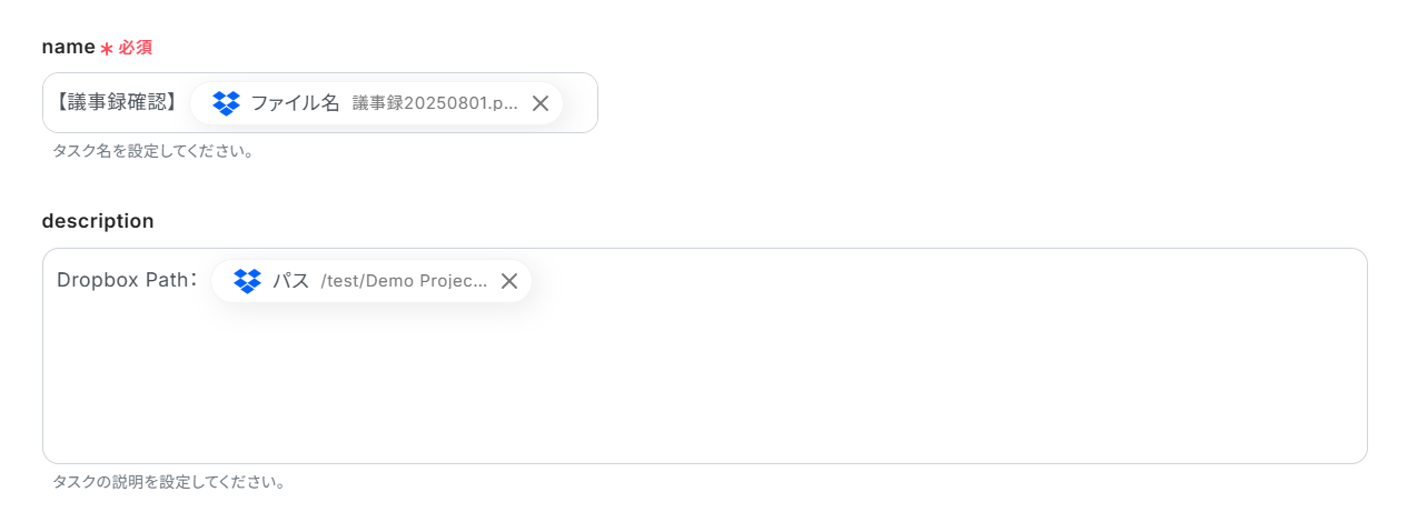 それでは、Dropboxから取得したファイル情報を用いてタスクを作成しましょう。