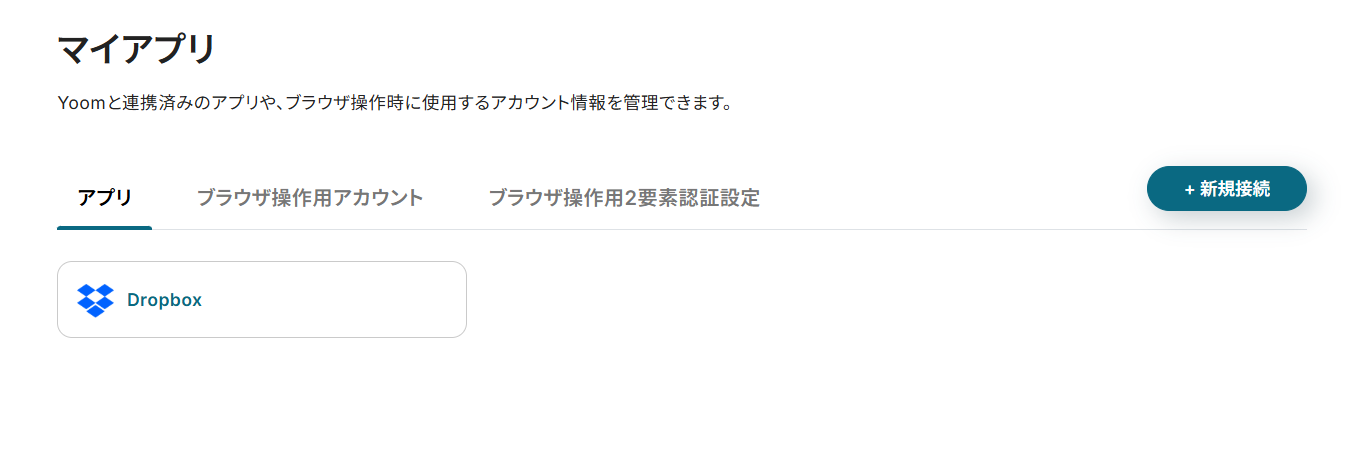 先ずは、Yoomと連携させたいDropboxアカウントとClickUpアカウントを「マイアプリ」に登録しましょう。