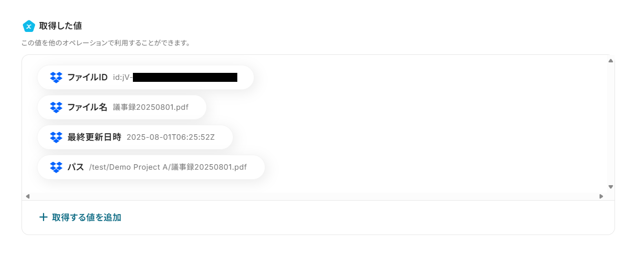 - テストに成功すると、「取得した値」にファイルの各情報が追加されます。