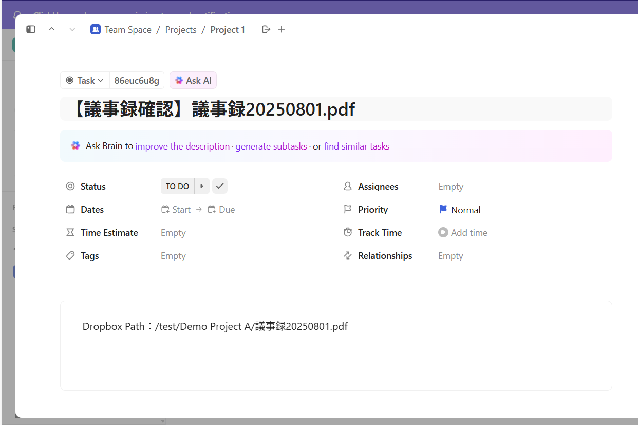 Dropboxの指定したパスにファイルをアップロードし、そのファイルに紐づくタスクがClickUpに作成されていれば成功です。