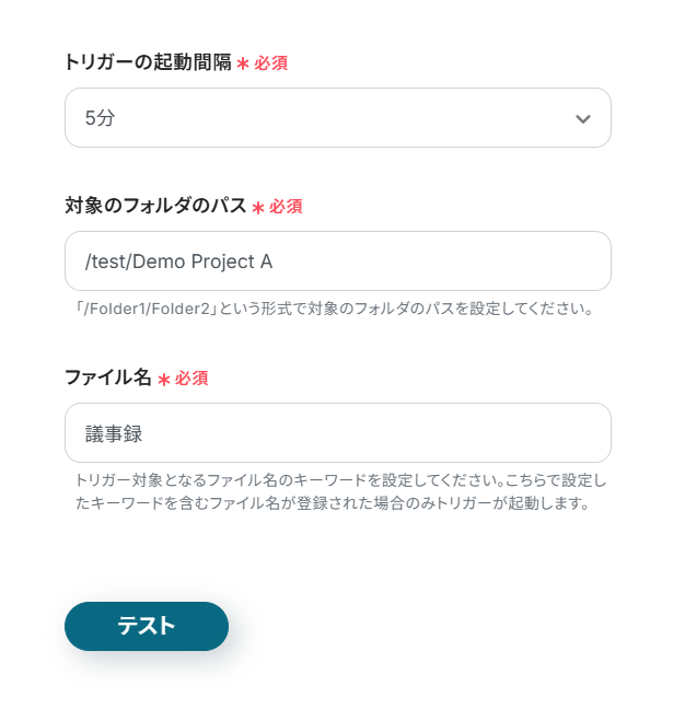 - 「対象のフォルダのパス」と「ファイル名」に、トリガー対象となるフォルダのパスとキーワードを指定しましょう。