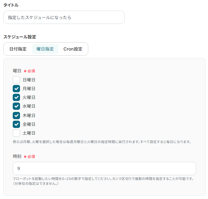 次に、トリガーの具体的な設定をしましょう。 「タイトル」は自由に変えられるので、お好みで編集してくださいね。 「スケジュール設定」では、下の赤枠部分のタブから日付や曜日を選んで、トリガーが起動するタイミングを設定できます。 お好きなタイミングに調整してください。