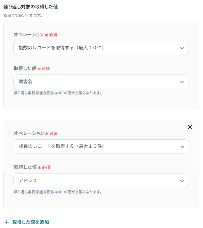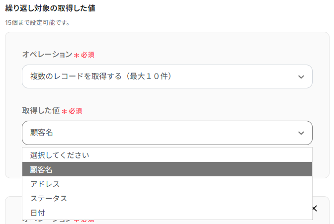 ここでは、繰り返しの対象を設定しましょう。 「タイトル」は、分かりやすいものに修正してもOKです。 「繰り返し対象の取得した値」には、プルダウンから運用状況に沿った内容を選択しましょう。