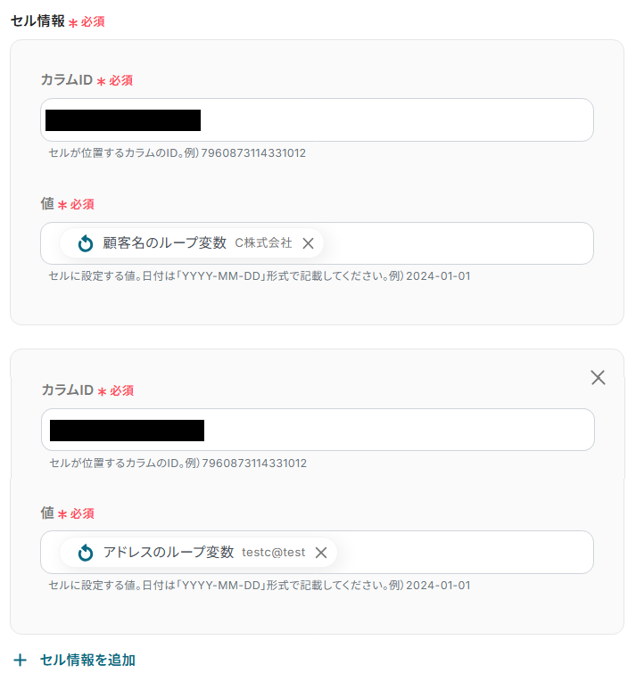 セルに反映させたい情報の数だけ、カムラIDと値を入力してください。(ページ最下部の「セル情報を追加」を押せば、入力欄を増やすことが出来ます) 今回は、下記のように反映したい情報を入力しました。