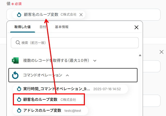 値:入力欄を選択し、前のステップで取得したアウトプットを選びましょう。 ※アウトプットについて詳しくはこちら をご覧ください。