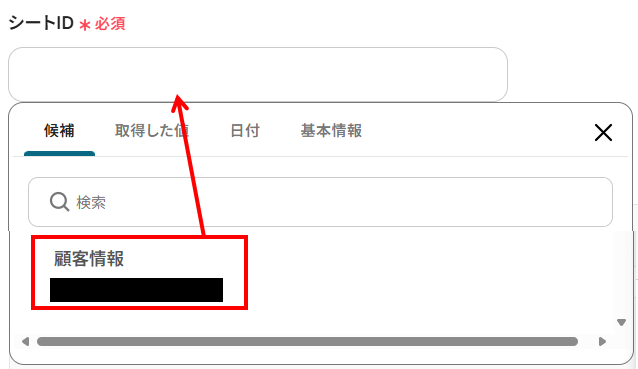 シートID:入力欄をクリックし、候補から選択しましょう。