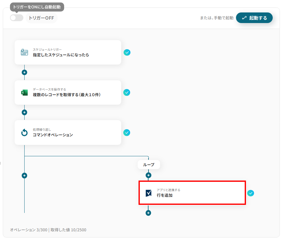 [注意事項] 「同じ処理を繰り返す」オペレーションを使う場合は、チームプランまたはサクセスプランが必要です。フリープラン・ミニプランだと、そのオペレーションやデータコネクトを設定してもエラーになってしまうのでご注意ください。 チームプランやサクセスプランなどの有料プランには、2週間の無料トライアルがついています。トライアル期間中は、通常は制限されるアプリや機能(オペレーション)も問題なく使えるので、この機会にぜひお試しくださいね。