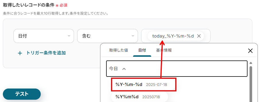 入力が完了したら、「次へ」を押して進みましょう。ここでは、取得するレコードの条件を設定します。取得したいレコードの条件は、追加や変更を自由に設定できます。 今回は、当日の日付になっているデータを条件にしたいので、下記のように設定しました。