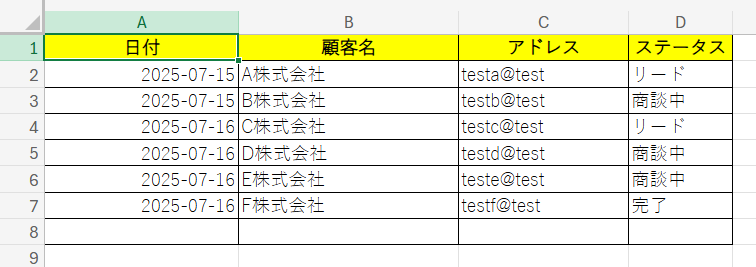 「データベースの連携」の画面になるので、連携するMicrosoft Excelの設定を行っていきましょう。 この画面で、対象のMicrosoft Excelファイルを選択します。 まだMicrosoft Excelファイルの準備が済んでいない場合は、この機会にMicrosoft Excelファイルを作成しておきましょう。 今回は、下記のようなMicrosoft Excelファイルを用意しました。