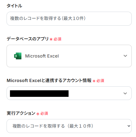 Microsoft Excelの準備ができたら、Yoomの画面に戻ってください。 タイトルとアカウント情報はステップ1で設定した内容が入力されています。なお、タイトルは任意でわかりやすい名前に変更可能です。 アクションは、テンプレート通りに「複数のレコードを取得する(最大10件)」のままで大丈夫です。