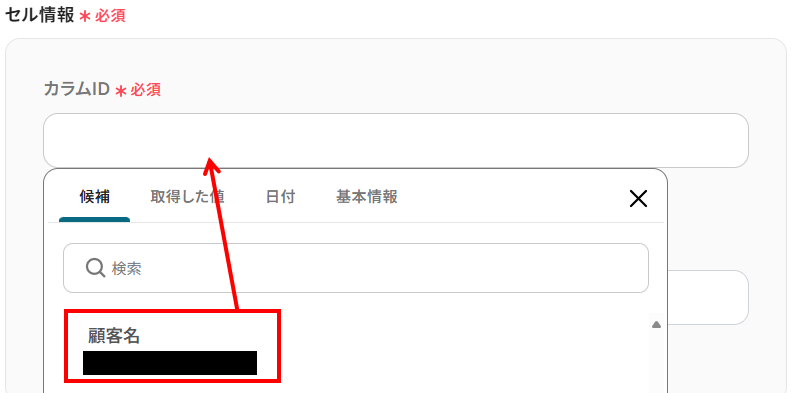 カラムID:こちらも入力欄をクリックし、候補からデータを反映させたいカラムを選びましょう。