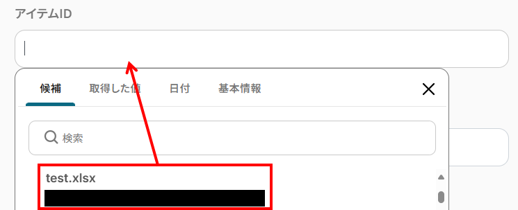 アイテムID:こちらも入力欄をクリックして候補から対象のMicrosoft Excelファイルを選択しましょう。