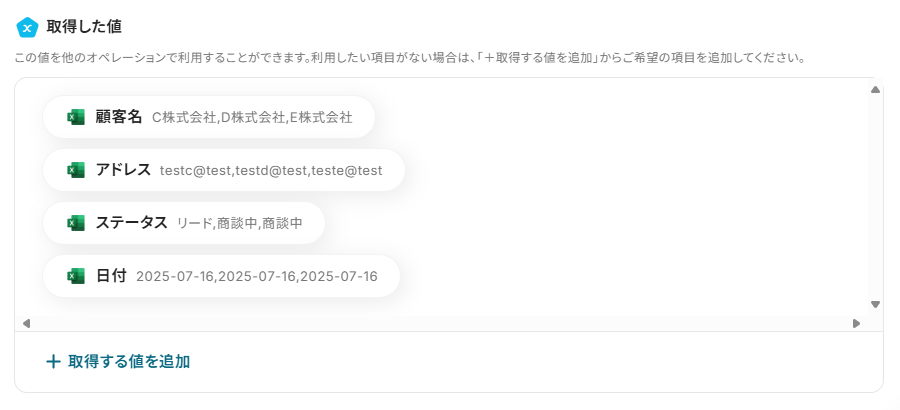 入力が完了したら、「テスト」を実行してください。成功すると、以下のような結果が表示されます。Microsoft Excelのデータが正しく反映されていれば問題ありません。 最後に「保存する」をクリックして、次のステップに進みましょう。