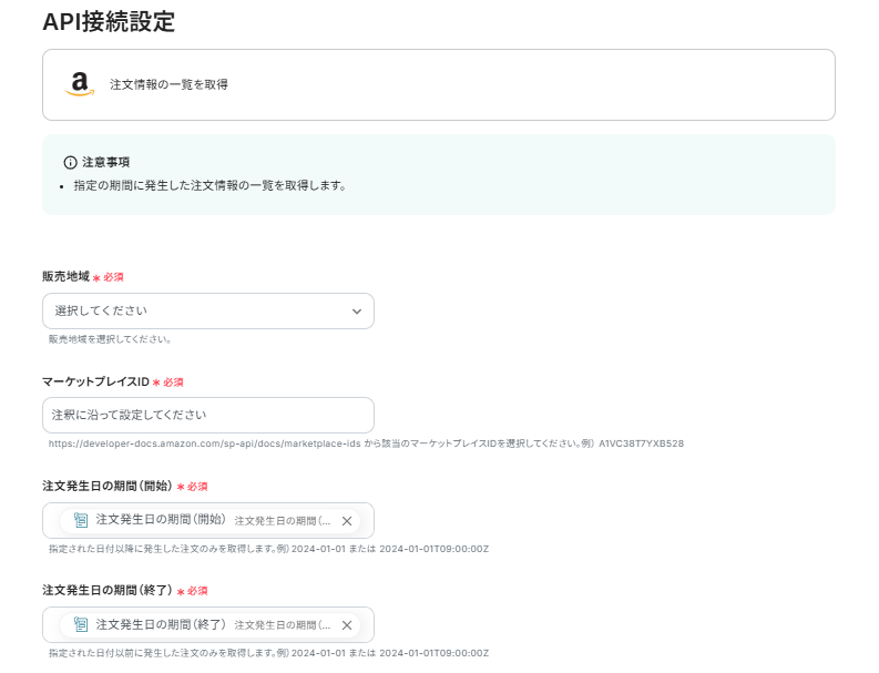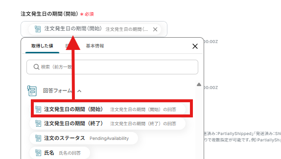 「注文発生の期間(開始)」「注文発生日の期間(終了)」「注文ステータス」は以下の画面のように、入力項目の下に表示される「取得した値」から選択しましょう。
