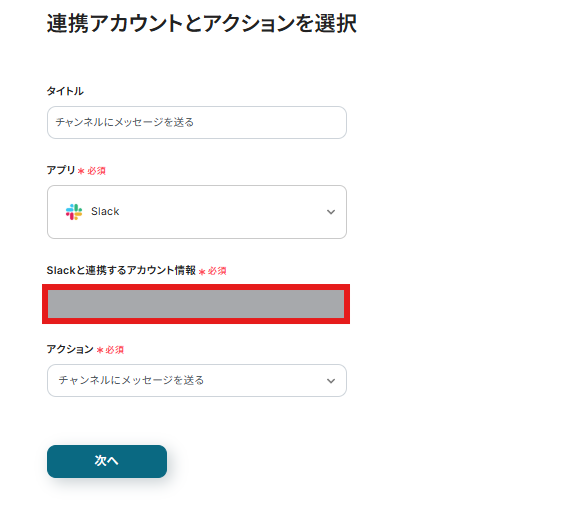 連携アカウントとアクションを選択する画面では今回連携するSlackのアカウントか確認し「次へ」をクリックしましょう。