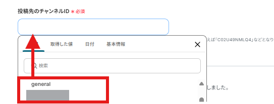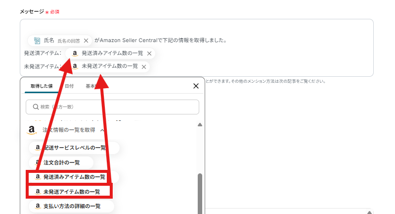 メッセージに挿入したい情報は、取得した値(アウトプット)から選択すると簡単に入力できます。