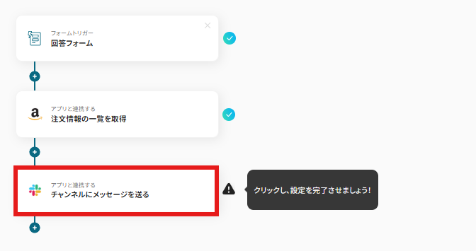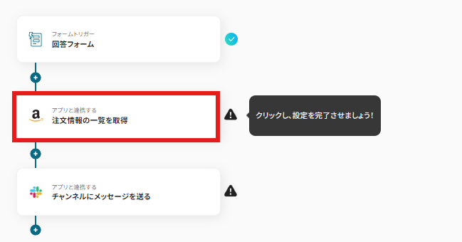 たとえば、フォームに注文情報の期間が回答された際に、自動的に期間内の注文情報をAmazon Seller Centralで取得し、Slackで共有することが可能です。