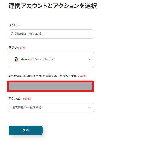 連携アカウントとアクションを選択する画面が表示されるので、今回連携するAmazon Seller Centralのアカウントで間違いないか確認しましょう!