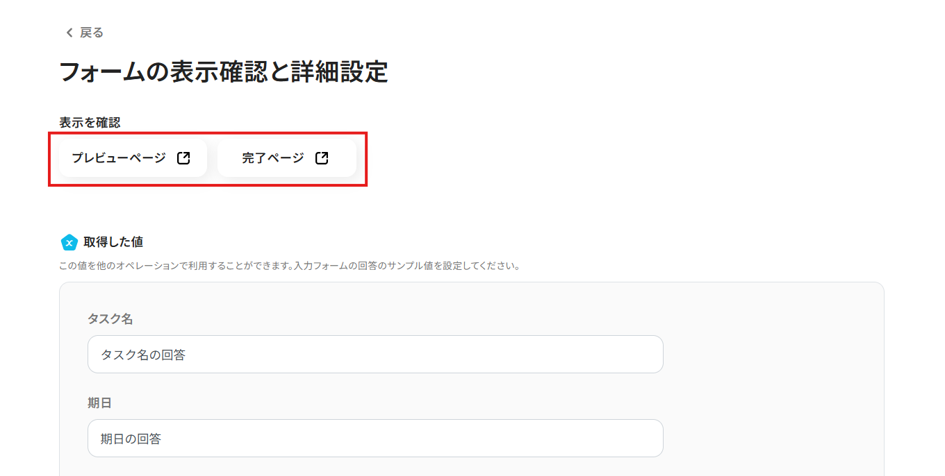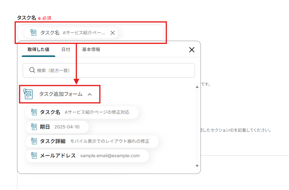 - 「タスク名」「タスクの説明」「期日」にはデフォルトで、ステップ3で取得した値(質問項目に対する回答)が設定されています。